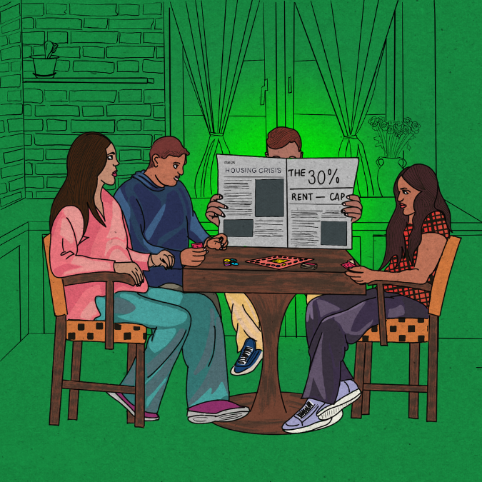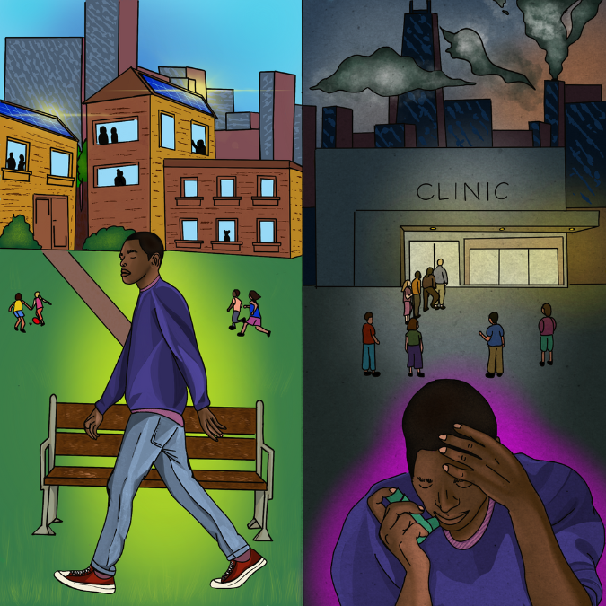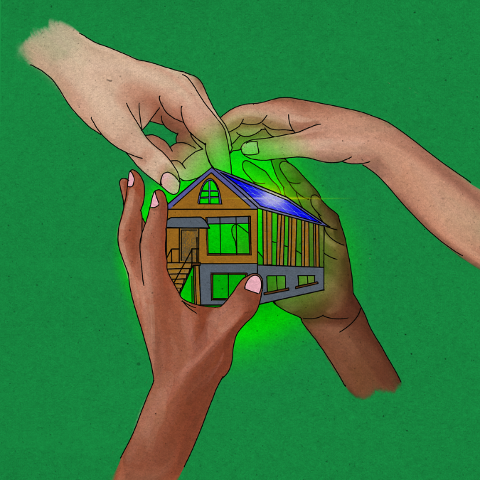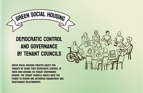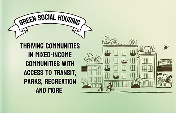 Melanie Diaz brings to life the issues and solutions of the environmental and housing justice fight for the IL Green New Deal Coalition through colorful digital illustrations, drawing comparisons between life in Chicago now and a future with Green Social Housing.
