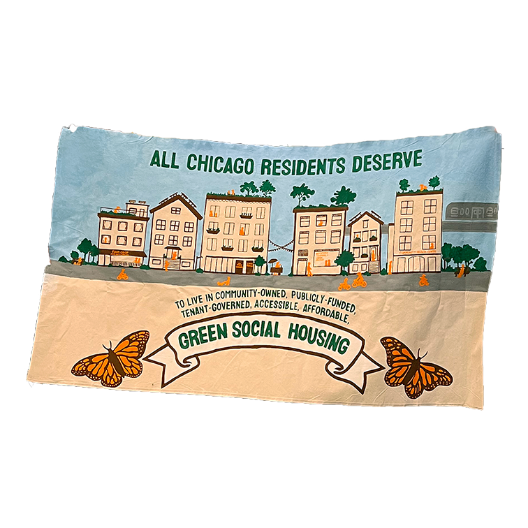 Navjot Heer placed the beauty of Green Social Housing at the heart of stunning banners and informational posters designed to engage coalition members in future art builds and public actions.